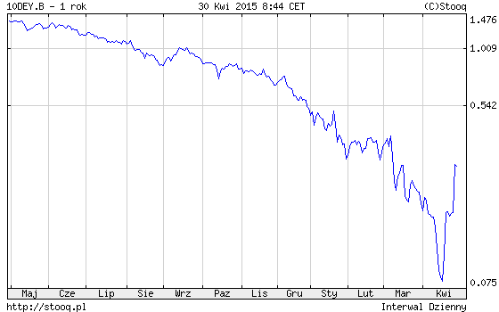 Te opinie były bez wątpienia jednym z czynników, które wywołały gwałtowny odwrót inwestorów z rynku Bundów. Na to nałożyły się także inne czynniki. Niemiecki rząd nie zdołał pozyskać zaplanowanej kwoty 4 mld EUR na aukcji obligacji 5-letnich. Nie znalazło się wystarczająco dużo chętnych do kupowania papierów przynoszących ... 0,07% straty rocznie (warto dodać, że na aukcjach nie kupuje Europejski Bank Centralny, który skup prowadzi tylko na rynku wtórnym - od dotychczasowych właścicieli).