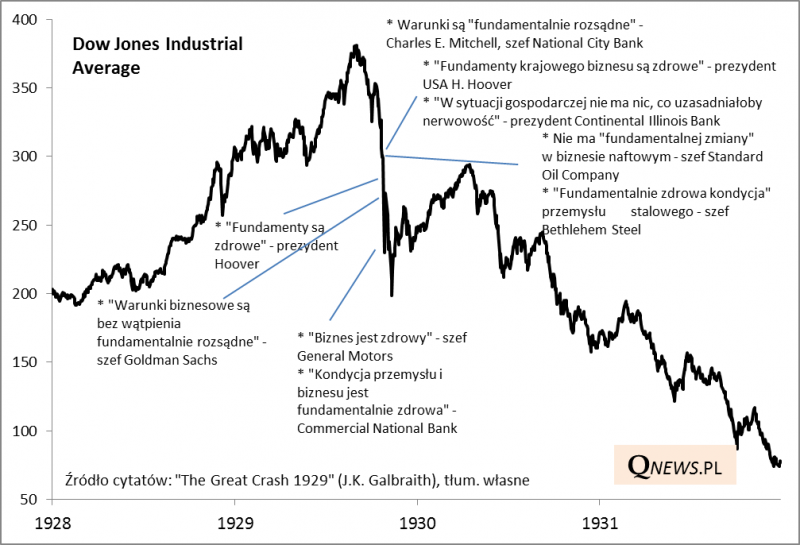 A teraz odwołajmy się do historii. W latach 50. znany ekonomista John Kenneth Galbraith napisał świetną książkę "The Great Crash 1929" będącą legendarną już wręcz kroniką wydarzeń i opinii towarzyszących pamiętnemu krachowi giełdowemu z 1929 roku, który stanowił preludium do Wielkiego Kryzysu lat 30. (to prawdziwa "lektura obowiązkowa"!).