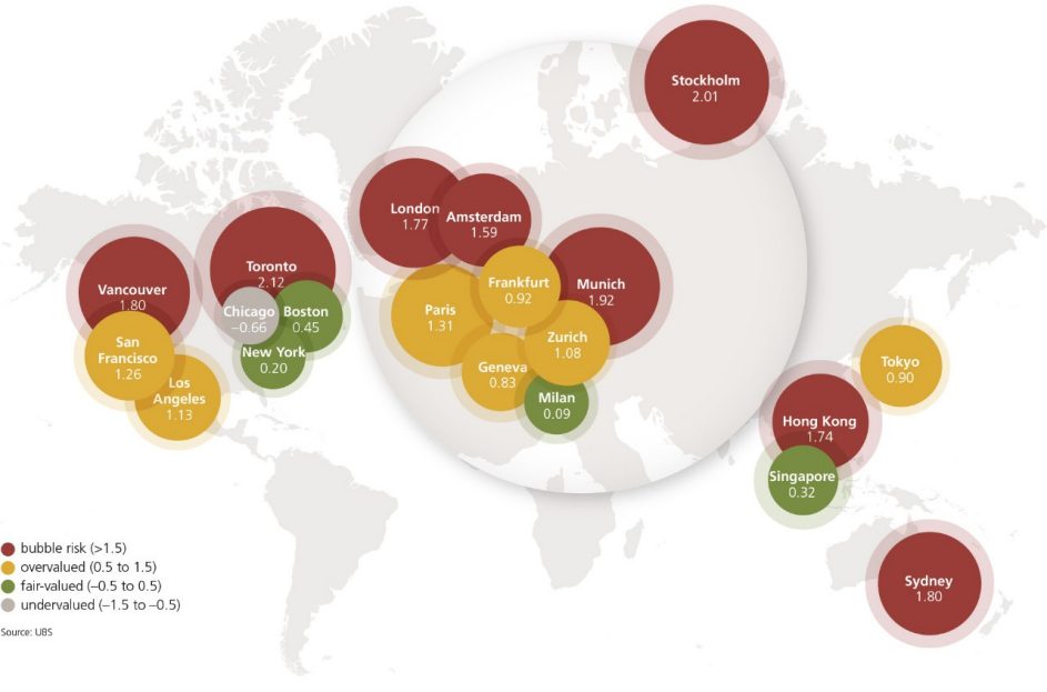 Historycznie zdarzało się, że polityka utrzymywania stóp procentowych na (zbyt) niskich poziomach przyczyniała się do powstawania baniek spekulacyjnych na rynkach nieruchomości. Klasycznym tego przykładem był rynek amerykański w latach 2005-2006. A teraz? Czy utrzymywana od czasów globalnego kryzysu finansowego ultra luźna polityka monetarna prowadzi do podobnych zagrożeń? Sytuację w nieruchomościach pod tym kątem monitoruje bank inwestycyjny UBS. Niestety jedynie w dwudziestu wybranych centrach finansowych (żadnego polskiego miasta w tym zestawieniu więc nie ma), niemniej rzućmy okiem na jego najnowsze konkluzje.
