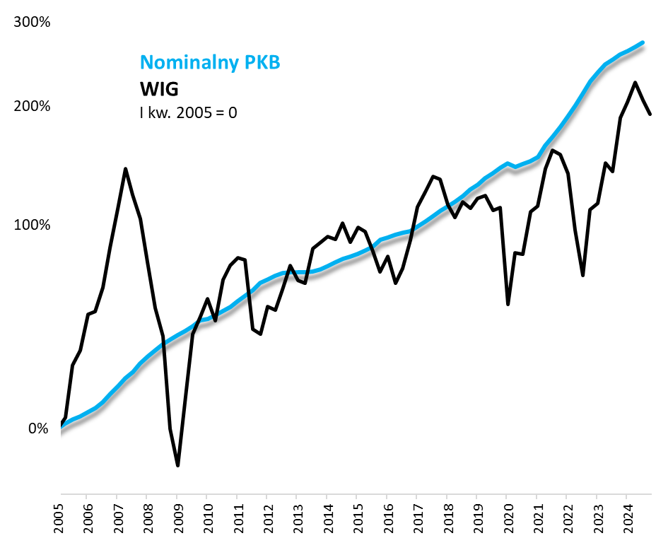 Na koniec coś bardziej pozytywnego, przynajmniej jeśli chodzi o długoterminową perspektywę. Podczas gdy dynamika wzrostu PKB potrafi zaskakiwać, a ostatnio te zaskoczenia są negatywne, to jednak na dłuższą metę polska gospodarka niemal nieprzerwanie rośnie. W przedstawionym na wykresie okresie od 2005 roku nominalny PKB powiększył się o ponad 270 proc. Jeśli założyć, że na dłuższą metę WIG powinien podążać w ślad za PKB (a tak historycznie było przez większość czasu), to można założyć, że obecnie jest za nisko (choć oczywiście nie aż tak nisko jak ostatnio np. w trakcie 2022 roku).