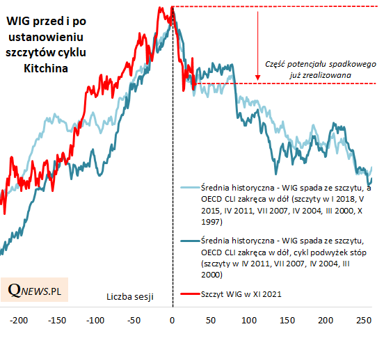 Gdyby WIG miał poruszać się uśrednionymi historycznymi ścieżkami wytyczonymi na wykresie, to w okolicach końcówki 2022 znalazłby się jakieś 22-23 proc. poniżej wspomnianego listopadowego szczytu hossy.