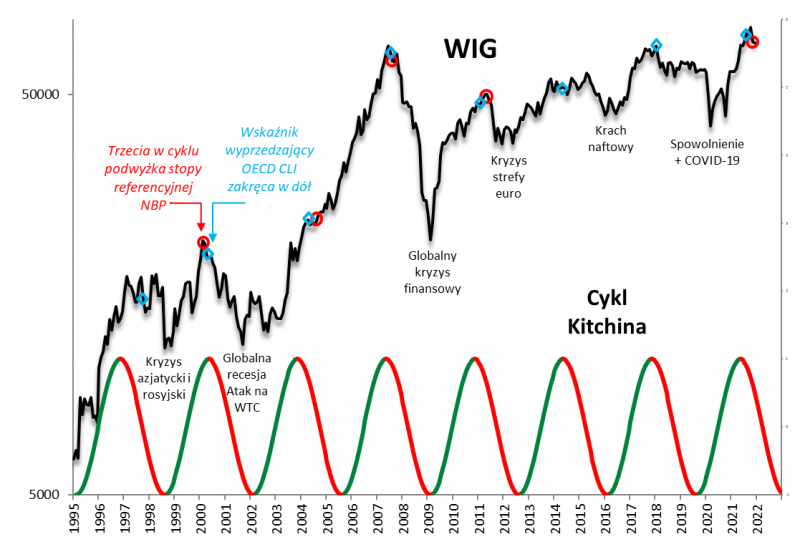 W analizie cyklu pod kątem prognoz na 2022 z pomocą przychodzi nam tym razem kilka faktów, o których częściowo pisaliśmy już w serii poprzednich analiz, ale które wymagają dalszego rozwinięcia. Przypomnijmy, z jakimi czynnikami natury makroekonomicznej i monetarnej mamy do czynienia. Po pierwsze jeden z naszych ulubionych wskaźników koniunktury gospodarczej, OECD-owski CLI (globalny indeks wskaźników wyprzedzających) z każdym miesiącem zakręca w dół. Po drugie mamy do czynienia z serią podwyżek stóp procentowych w naszym kraju.