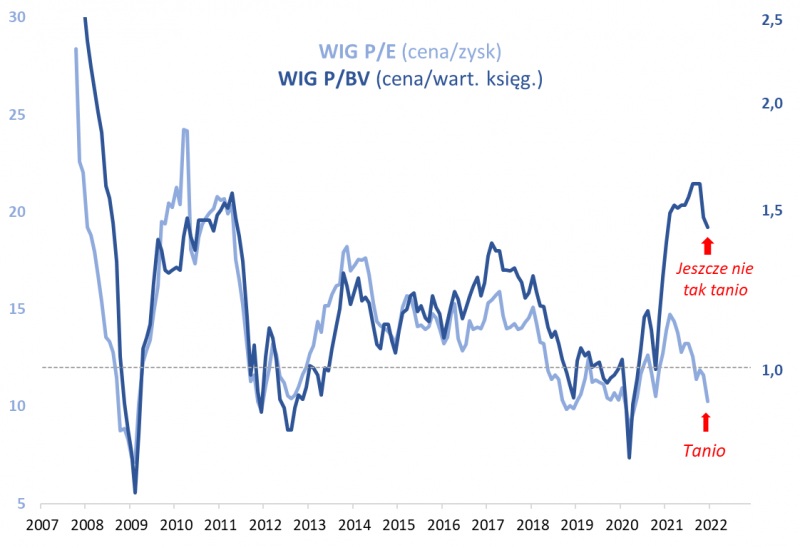 ??? Wyceny akcji – na GPW z pewnością nie jest drogo, ale nie możemy wystawić jednoznacznej diagnozy czy jest już tanio (niski poziom P/E może być zaburzony przed post-pandemiczny wystrzał zysków spółek, z kolei niewrażliwy na wahnięcia zysków P/BV potrafił z obecnych poziomów jeszcze sporo spaść)