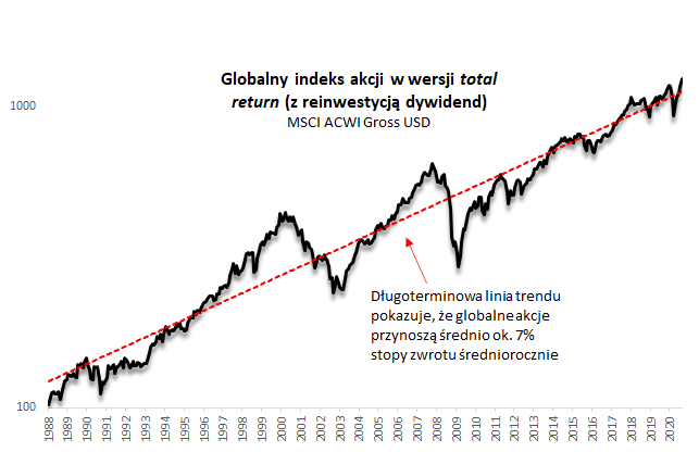 Zerknijmy też na długoterminowy horyzont inwestycyjny. Dobra wiadomość jest taka, że w perspektywie wielu lat (dekad) globalny indeks giełdowy przynosi zyski. Średnioroczna stopa zwrotu (z uwzględnieniem reinwestycji dywidend) to ok. 7%, licząc od początku historii MSCI ACWI (XII 1987).