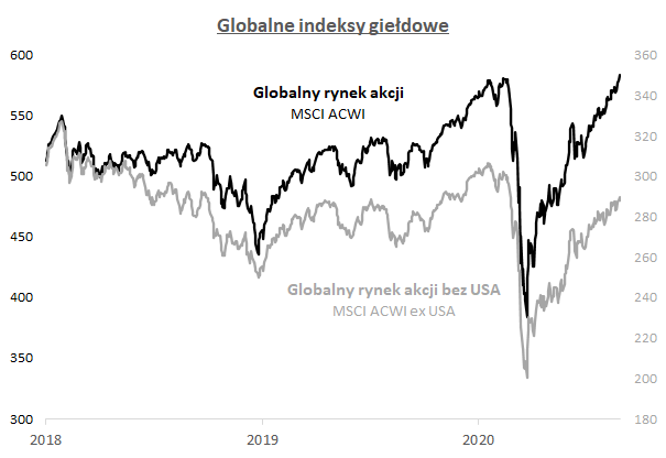 Narzekać można jedynie na to, że jeśli spojrzeć na wersję tego indeksu z pominięciem USA, okazuje się, że "reszta świata" nie odrobiła jeszcze całych strat. Mało tego, indeks bez akcji z Wall Street jest na dodatek ciągle poniżej historycznego maksimum ze stycznia 2018. Innymi słowy, w skali ostatniego 2,5 roku jest "pod kreską".