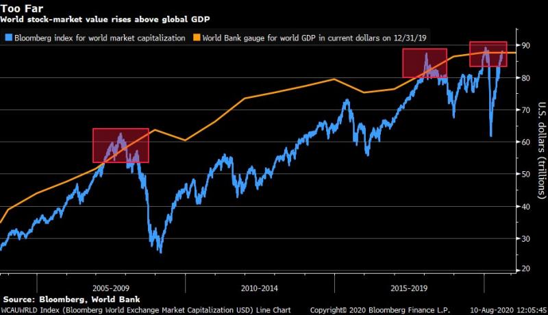 Oznacza to, że wartość akcji notowanych na świecie znów przekroczyła poziom globalnego PKB (87,8 bln USD w 2019 r. wg danych Banku Światowego; warto tu dodać, że tegoroczny PKB będzie zapewne mniejszy niż ubiegłoroczny).