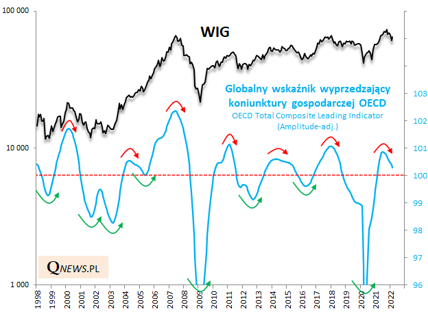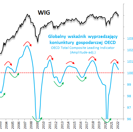 Wskaźniki wyprzedzające koniunktury (CLI) organizacji OECD to stała pozycja na naszej liście obserwacyjnej. Najważniejszy z nich, zagregowany na podstawie danych dla wszystkich krajów zestawionych przez OECD, w marcu pogłębił dotychczasowy trend spadkowy, trwający od jesieni ub.r. Znalazł się na poziomie najniższym od dokładnie roku. Ciągle nie jest to jednak na tyle spory spadek ze szczytu, by należało zakładać, że całe spowolnienie koniunktury jest już za nami (niemal zawsze spadał wyraźnie poniżej granicy 100 pkt.). Równoległa zadyszka rodzimego WIG-u, który w pewnym momencie znalazł się nawet 25% poniżej szczytu hossy, jest jak widać ściśle skorelowana z tym trendem - akcje są silnie wyczulone na wahania koniunktury gospodarczej.