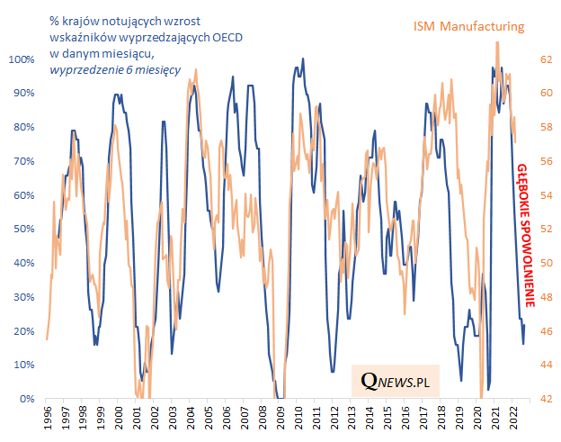 Ze wskaźników OECD można wycisnąć jeszcze dalej idącą moc wyprzedzającą, jeśli obliczy się tzw. indeks dyfuzji (Diffusion Index), który mierzy jaki odsetek krajów notuje poprawę CLI. Okazuje się, że taki indeks dyfuzji potrafi nawet z półrocznym wyprzedzeniem prognozować (z grubsza) kierunek trendu wskaźników takich jak popularny barometr koniunktury w amerykańskim przemyśle ISM Manufacturing (to kolejna obowiązkowa pozycja na naszej liście obserwacyjnej). Teraz kreślona przez niego wizja jest jednoznacznie negatywna - zapowiada głębokie spowolnienie koniunktury w dalszej części roku (ISM powinien znaleźć się sporo poniżej granicy 50 pkt.). Jednocześnie marcowe lekkie drgnięcie w górę indeksu dyfuzji daje jakieś wstępne szanse na szukanie dołka na jesieni br.