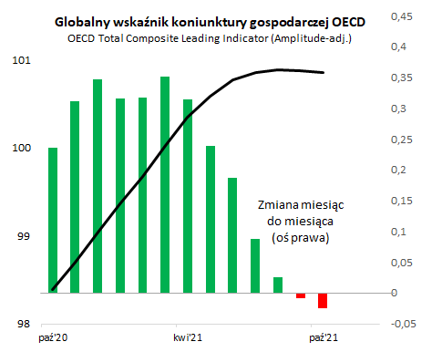 Jeden z naszych ulubionych barometrów cyklu koniunkturalnego w gospodarkach, globalny wskaźnik wyprzedzający OECD (CLI, Composite Leading Indicator), wykazuje postępujące objawy zadyszki. Po prawie półrocznym hamowaniu tempa wzrostu CLI, teraz mamy do czynienia z kolejną fazą - wskaźnik zaczął spadać po raz pierwszy od kwietnia 2020.