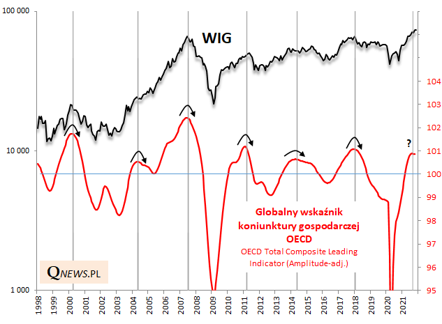 Najważniejsze zastrzeżenie do tego użytecznego wskaźnika jest takie, że w jego konstrukcję są wpisane rewizje historycznych danych, sięgające czasem daleko wstecz. Dlatego w optymistycznym scenariuszu mogłoby się okazać, że widoczna obecnie zmiana trendu na spadkowy potem zostanie "wymazana" (to się zdarzało). Niemniej na tym etapie zachowanie wskaźnika OECD sygnalizuje ryzyko pogłębiającej się zadyszki w gospodarkach, która potencjalnie może rzutować negatywnie na rynki akcji w horyzoncie wielomiesięcznym.