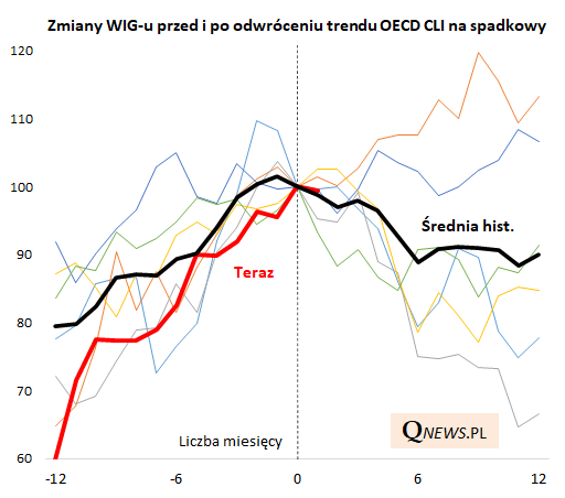 Jeśli zestawimy te wszystkie przypadki, to okazuje się, że uśredniona ścieżka WIG-u wraz ze zmianą trendu OECD CLI na spadkowy również zaczyna zakręcać w dół i nie jest to zmiana na przysłowiową chwilę, lecz raczej w średnim terminie (6 miesięcy i więcej).