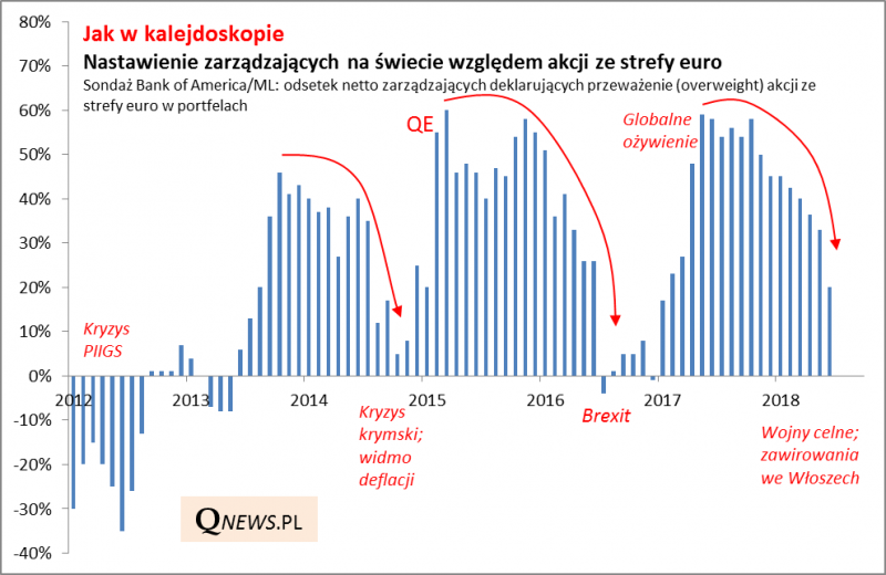 A teraz? Wystarczyło pogorszenie danych makro w eurolandzie, groźba wojny handlowej z USA oraz zawirowania polityczne we Włoszech, by zachwyt uległ poważnemu schłodzeniu. Teraz już tylko 20% netto ankietowanych deklaruje przeważenie. Co ciekawe czerwcowy spadek tego odsetka okazał się największy od ... lipca 2016, kiedy wystraszono się "Brexitu".