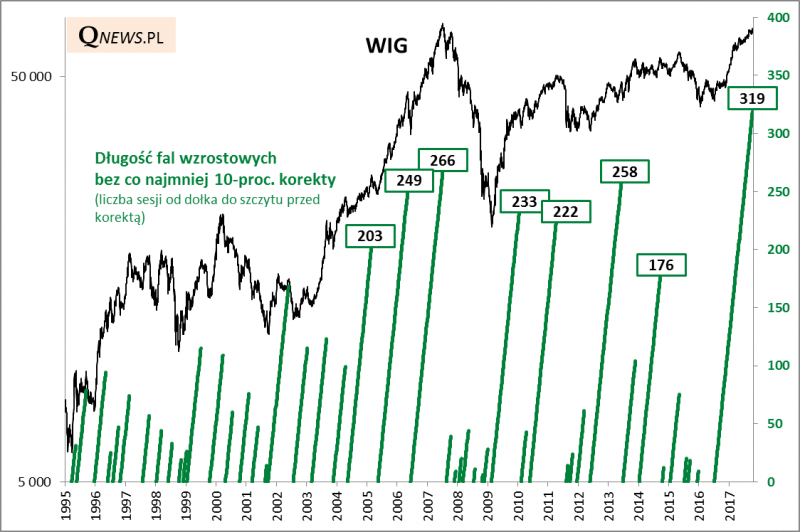 Jednocześnie warto pamiętać jednak o tym, że od bardzo dawna nie mieliśmy na GPW większej korekty. Pokusiliśmy się o precyzyjne obliczenia. Od ostatniego co najmniej 10-proc. spadku WIG-u minęło właśnie 319 sesji (czyli ok. 15 miesięcy). Jeśli nasze kalkulacje są poprawne, to jest to absolutny rekord w historii warszawskiej giełdy (nie licząc dość specyficznych pierwszych kilku lat funkcjonowania GPW). Poprzedni rekord został ustanowiony ... na wspomnianym szczycie hossy z 2007 roku. I wynosił "zaledwie" 266 sesji. Bez wątpienia mamy do czynienia z bezprecedensowym fenomenem.