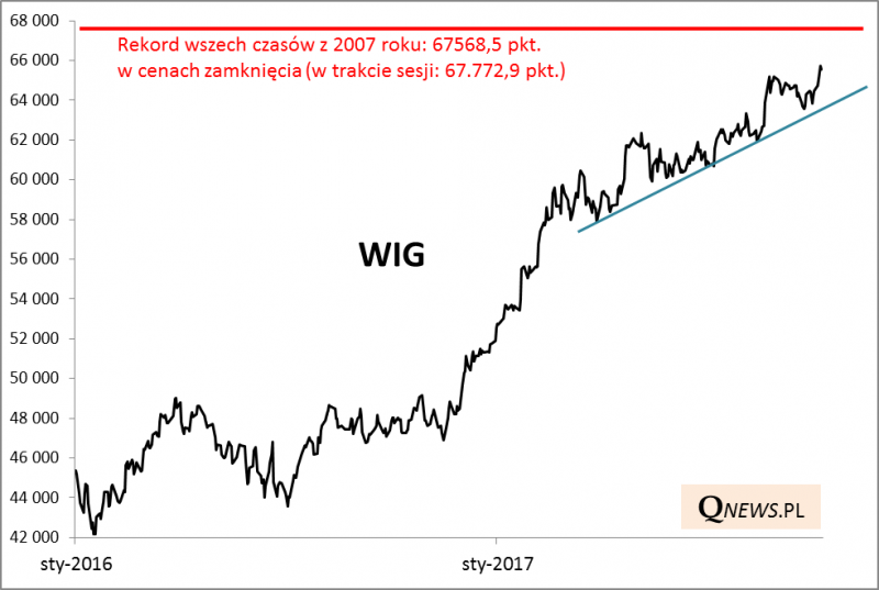 Na środowej sesji WIG zbliżył się jeszcze bardziej do rekordu wszech czasów z 2007 roku. Żal byłoby nie pokusić się o atak na ten pułap, na którego pokonanie czekamy już od ponad dziesięciu lat. Miejmy nadzieję, że wystarczy impetu, by WIG w bliskiej przyszłości zdążył jeszcze zająć się realizacją tego celu...