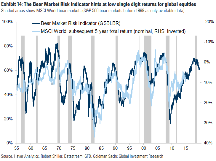 Reasumując, wskaźnik Goldman Sachs pokazuje, że po 20-proc. załamaniu na giełdach w 2018 roku ryzyko bessy powoli maleje, choć ciągle jest relatywnie wysokie (61%). Niezależnie od krótkoterminowych rozważań należy oczekiwać raczej słabych stóp zwrotu z globalnych akcji w kolejnych pięciu latach.