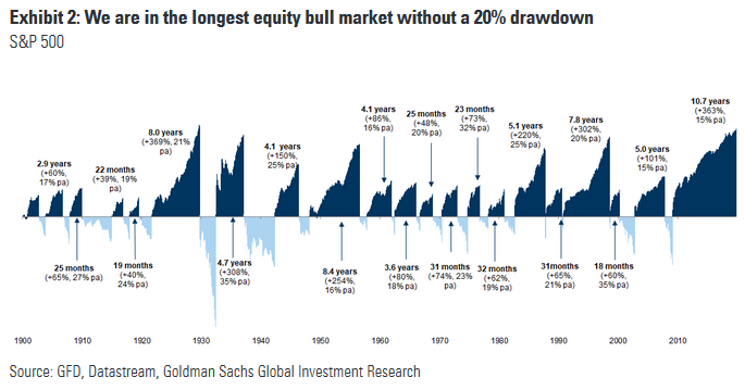 Z drugiej strony owe prawdopodobieństwo jest ciągle relatywnie wysokie (61%). Poza tym Goldman zwraca uwagę, że o ile definicja bessy została w 2018 roku spełniona formalnie w przypadku MSCI World, to nie w przypadku S&P 500. Wg wyliczeń banku ten amerykański indeks rośnie bez 20-proc. spadku (zapewne w cenach zamknięcia) od 10,7 roku, co jest absolutnym historycznym rekordem.