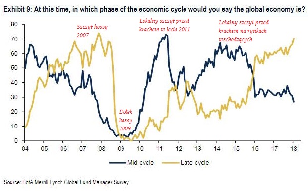 Rzecz jasna, przyspieszenie polskiego PKB jest efektem podobnej tendencji w globalnej gospodarce. A skoro o tym mowa, to ciekawie w te rozważania wpisuje się najnowszy sondaż Bank of America/Merrill Lynch wśród zarządzających funduszami (Global Fund Manager Survey). Prawie 70% menedżerów uważa, że globalna gospodarka jest w późnej fazie cyklu koniunkturalnego ("Late-cycle").