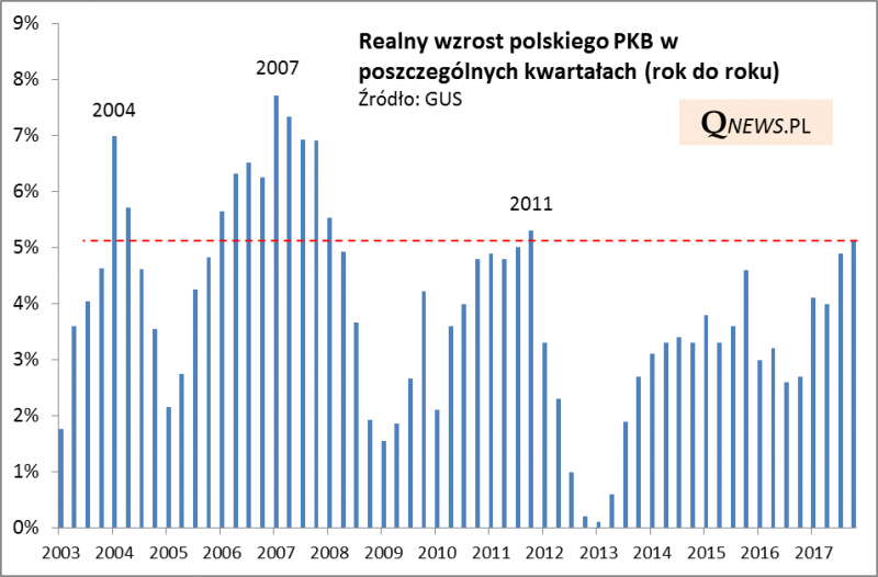 Według wstępnego odczytu polski PKB urósł w IV kwartale 2017 o 5,1%. To dane najlepsze od 2011 roku i niewiele brakuje, by najlepsze także od 2008 roku. Rzut oka na wykres pokazuje, że polska gospodarka była w stanie osiągnąć szybszy wzrost praktycznie wyłącznie w latach 2006-2007 (choć odbyło się to kosztem rosnącej nierównowagi, czego wyrazem były bujające w obłokach ceny nieruchomości i eksplozja zadłużenia we frankach).
