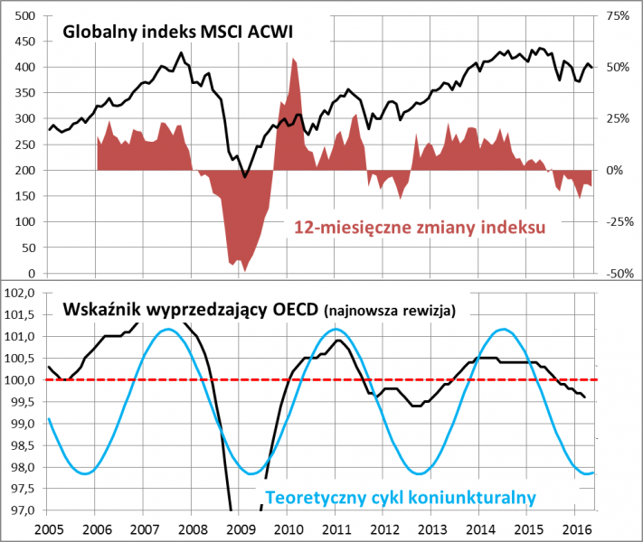 Wszystko to na pierwszy rzut oka wygląda groźnie - gospodarki ciągle słabną. Gdyby to porównać z pamiętnym rokiem 2008, to jesteśmy gdzieś w maju tamtego roku, co oznaczałoby, że najgorsze - czyli kryzysowa faza spowolnienia - jeszcze przed nami. Ale na szczęście to nie jest jedyny scenariusz. Równie dobrze możemy być na nowo na jesieni 2011 r., czyli już po pamiętnym letnim krachu, a jednocześnie przed poprawą koniunktury - wówczas spowolnienie okazało się dużo płytsze. Zwróćmy uwagę, że rynki akcji mają za sobą ciężkie 12 miesięcy - to sugeruje, że osłabienie gospodarcze, przynajmniej na obecnym etapie, jest już wkalkulowane w ceny. Nasza "mechaniczna" analiza cyklu koniunkturalnego przemawia raczej za tym drugim wariantem. Powtarzający się od lat cykl teoretycznie powinien właśnie wychodzić z dołka koniunktury. Jeśli zatem nie dojdzie do jakichś szoków w stylu upadku Lehman Brothers, to mamy szansę na cykliczną poprawę.