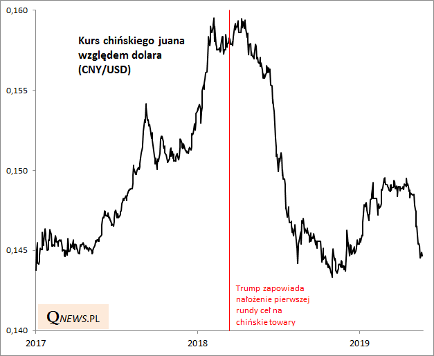 W omawianym wczoraj raporcie Goldman Sachs zwrócił uwagę, że chińskie władze walczyć będą ze skutkami nowych ceł nakładanych przez administrację Trumpa poprzez spadek wartości (deprecjację) swej waluty. Tak też faktycznie się dzieje, i to już od wielu tygodni. Dzięki osłabianiu się juana chińskie towary stają się relatywnie tańsze (atrakcyjniejsze) w przeliczeniu na dolary, co częściowo "buforuje" wpływ ceł.