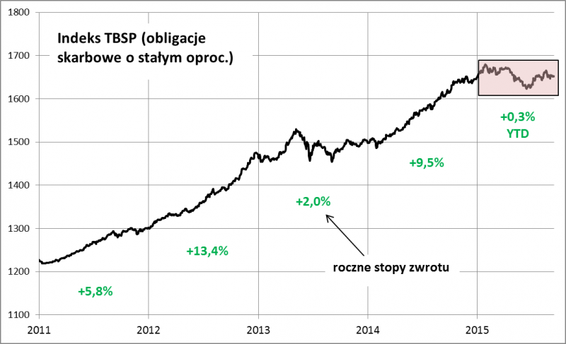 Indeks TBSP gromadzący obligacje o stałym oprocentowaniu (czyli te najbardziej wrażliwe na wahania stóp procentowych) tkwi w tym roku w trendzie bocznym - po hossie pozostało wspomnienie.