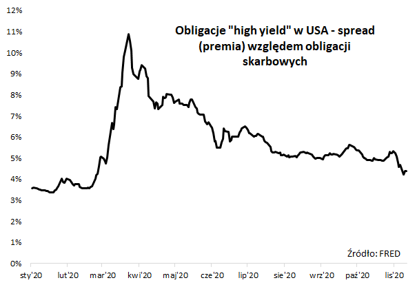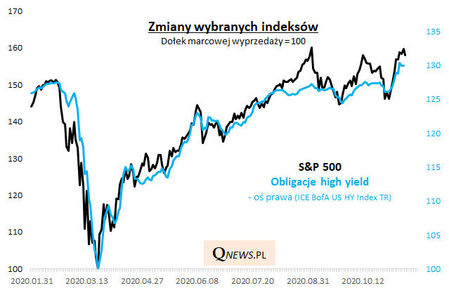 O ile w sierpniu i październiku indeks S&P 500 dopuścił się falstartu, próbując przyspieszyć zwyżkę bez potwierdzenia ze strony obligacji firm, to ostatni ruch w górę zyskał już takie potwierdzenie. Również indeks "high yield" zawędrował na rekordowe poziomy, ciesząc się najwyraźniej z perspektywy szybszego wdrożenia szczepionki na COVID-19.