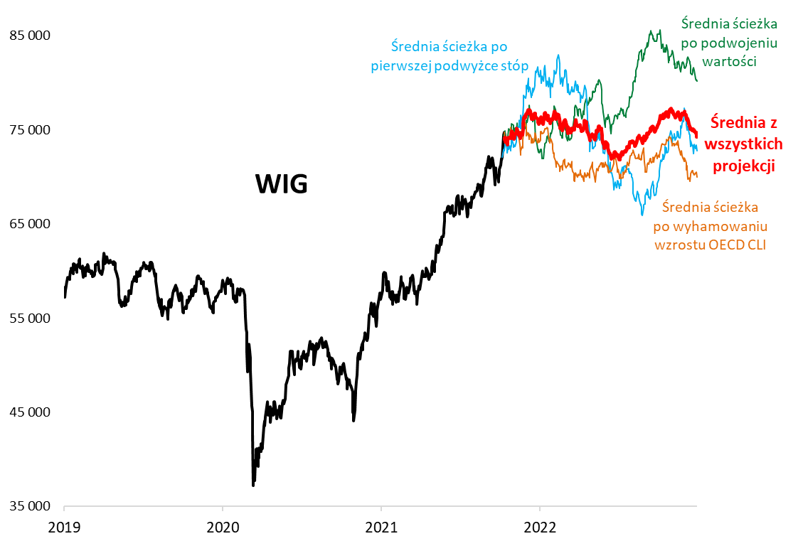 Opisaliśmy trzy różne projekcje wynikające z zupełnie odmiennego sposobu analizowania sytuacji (polityka monetarna, statystyka, analiza makroekonomiczna). Pojawia się pytanie – jaki obraz wyłoni się, gdy spróbujemy je uśrednić? Na to pytanie odpowiada trzeci wykres. Pokazujemy na nim zarówno jakie perspektywy wynikają dla WIG-u zarówno z poszczególnych podejść, jak i z uśrednionej ścieżki („trzy w jednym”).