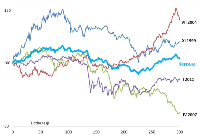 Uśrednienie czterech historycznych ścieżek po podwojeniu wartości daje w miarę optymistyczną wizję rozwoju wydarzeń, wg której WIG mimo naturalnych korekt po drodze powinien w przyszłym roku ciągle bić rekordy wszech czasów. Warto tu wszakże podkreślić, że wykluczenie z tego porównania wspomnianego najstarszego przypadku (1996) zdecydowanie spłaszczyłoby uśrednioną ścieżkę.