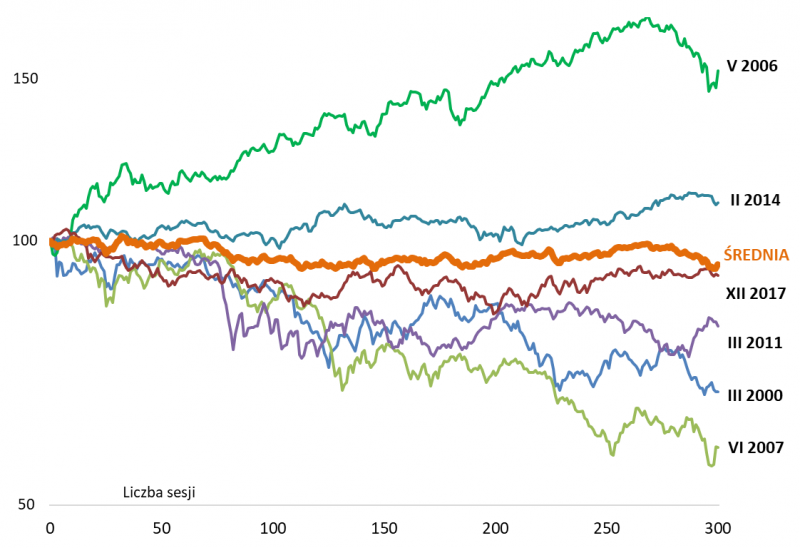 Podsumowując tę kwestię, o której szerzej pisaliśmy przed tygodniem, pierwsza podwyżka stóp nie oznaczała średnio rzecz biorąc natychmiastowego końca hossy, ale po ok. 90 sesjach (nieco ponad czterech miesiącach) uśredniona ścieżka zaczyna zakręcać powoli w dół.