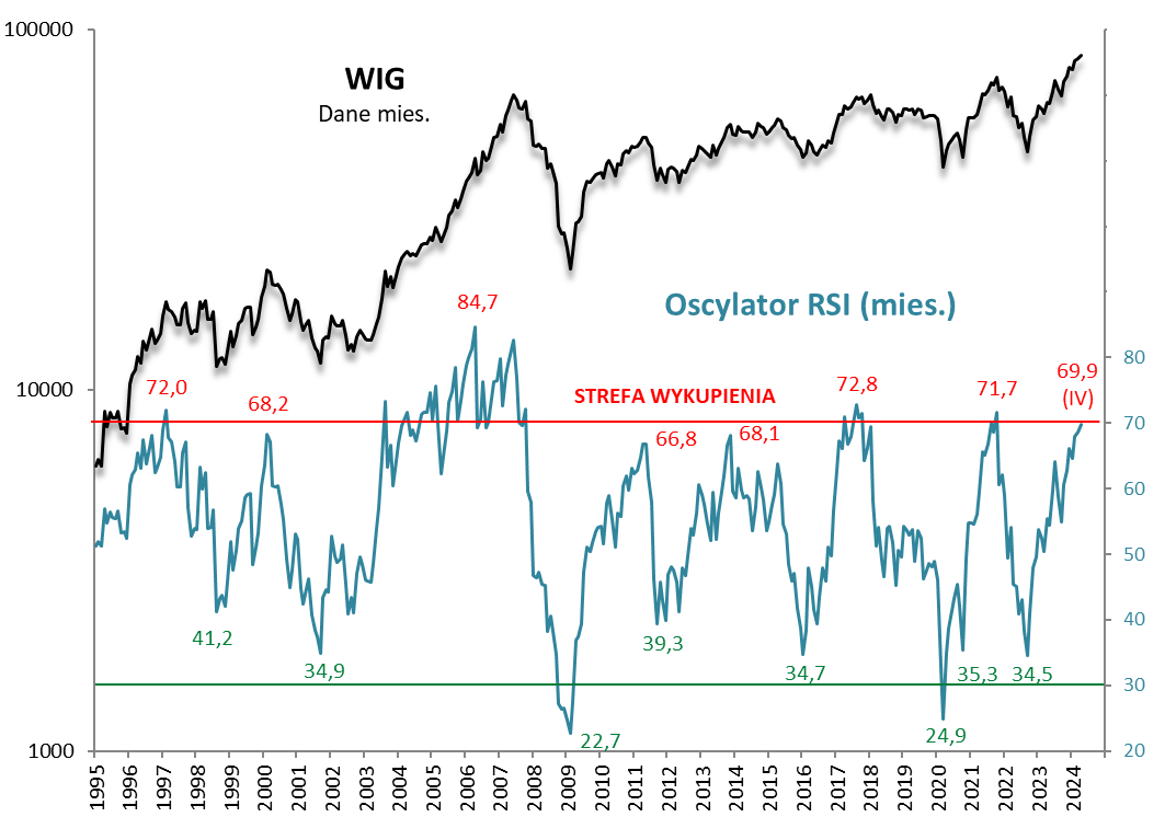 Rys. 2. W kwietniu miesięczny RSI dotknął strefy wykupienia, a w maju do niej wkracza