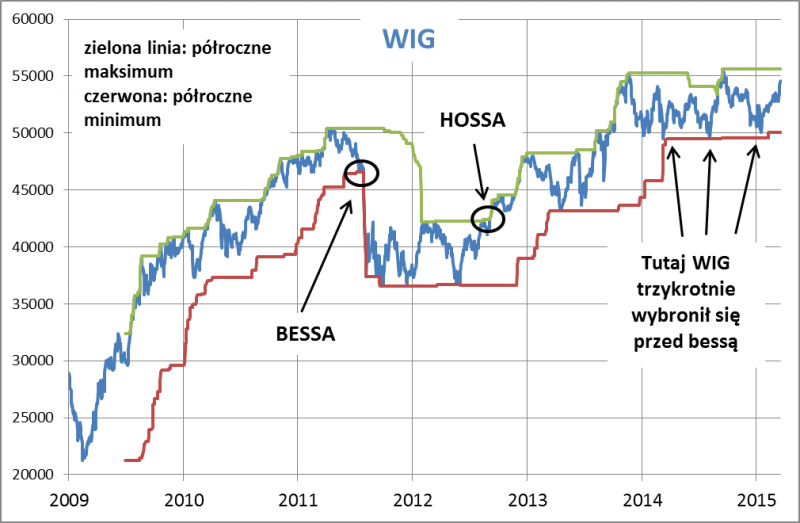 W poszukiwaniu wskazówek pozwalających odróżnić rynek byka od rynku niedźwiedzia warto oczywiście przyjrzeć się historii. Na bazie takich obserwacji oparte jest nasze proste, ale sprawdzone na przestrzeni lat kryterium zaczerpnięte z prostej analizy technicznej. Otóż stwierdziliśmy, że kiedy indeksy giełdowe wspinały się na poziom półrocznego maksimum (precyzyjnie - najwyższy od 126 sesji), można to było uznać za sygnał hossy. Kiedy zaś indeksy wędrowały poniżej poziomu półrocznego minimum, był to sygnał odwracania się trendu na spadkowy. Poniżej ilustrujemy tę koncepcję na wykresach głównych wskaźników GPW.