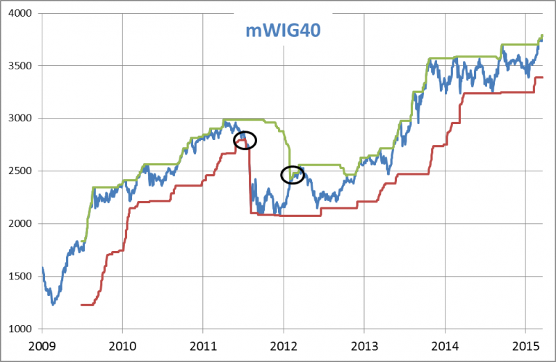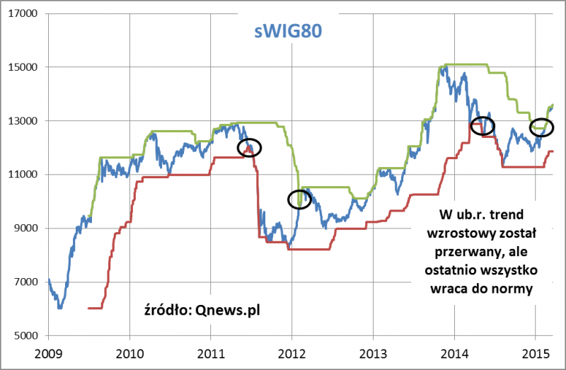 Jak widać, w ubiegłym roku kontynuacja hossy stała pod znakiem zapytania. WIG kilkakrotnie zbliżał się do półrocznego minimum (ostatecznie za każdym razem się wybronił). Sygnał bessy wysłał w ub.r. tylko indeks małych spółek i to na szczęście tylko przejściowo. Ostatnio ten sygnał został anulowany.