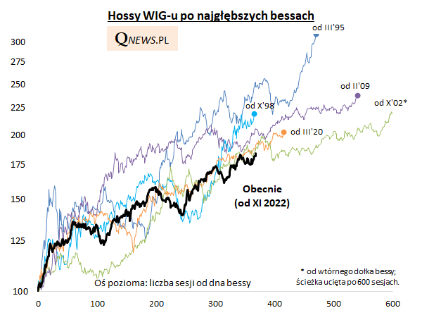 Ustanawiając nowy rekord, WIG wydłużył czas trwania obecnej hossy do prawie 370 sesji, a zasięg zwyżki powiększył do prawie 84 proc. Pod względem czasu trwania obecny trend wzrostowy dorównał już temu rozpoczętemu na jesieni 1998 (po tzw. kryzysie rosyjskim) i trwającemu do czasu pęknięcia tzw. bańki internetowej w marcu 2000, a jednocześnie stopniowo zbliża się do poprzedniej hossy, która od covidowego dołka z marca 2020 trwała 416 sesji (różnica względem niej wynosi więc obecnie ok. 2 miesięcy).