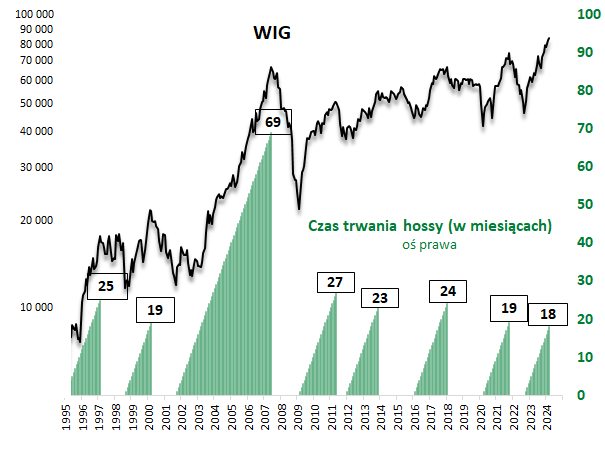 W szerszym ujęciu marzec był już 18. miesiącem hossy na krajowym rynku akcji, rozpoczętej na jesieni 2022. Jak ta liczba wygląda na tle historycznych statystyk? Dobra wiadomość jest taka, że żaden z cyklicznych rynków byka nie skończył się po 18 miesiącach. Nawet dwie najkrótsze hossy (w tym ta poprzednia, zakończona w 2021 roku, oraz ta z finiszem w 2000 r.) trwały po 19 miesięcy. Statystyki sugerują zatem, że nawet w najgorszym wariancie obecny trend wzrostowy jeszcze się nie zakończył i mógłby dobiec końca najwcześniej w rozpoczynającym się kwietniu. Podkreślmy, że owe 19 miesięcy to najbardziej pesymistyczny wariant, bo pozostałe typowe hossy trwały raczej od 23 do 27 miesięcy (nie wspominając już nawet o "podwójnej" super hossie z lat 2003-07).
