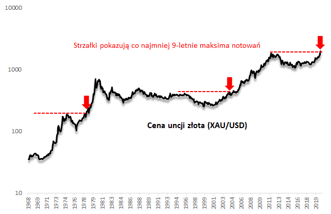 Widać, że po osiągnięciu co najmniej 9-letniego maksimum po okresie posuchy złoto nie spoczywało na laurach. Trendy wzrostowe były kontynuowane jeszcze przez wiele miesięcy na zasadzie efektu tzw. momentum (czyli zwyżki siłą rozpędu).
