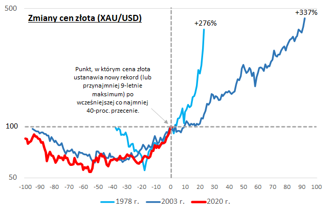 Na sytuację na rynku złota zerknijmy z punktu widzenia długoterminowej analizy technicznej. Lipcowe pokonanie szczytu poprzedniej hossy sprzed ok. dziewięciu lat skłania do sprawdzenia co historycznie działo się, gdy pojawiał się podobny sygnał. We współczesnej historii złota (czyli od czasu załamania systemu walutowego z Bretton Woods we wczesnych latach 70.) wyłowiliśmy dwa takie epizody - w 2003 roku (cena najwyżej od 1990) oraz 1978 (pokonanie szczytu z 1974).