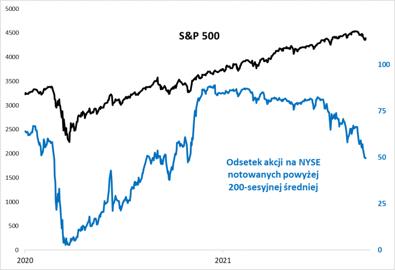 W wersji bardziej pesymistycznej systematycznie pogarszająca się szerokość rynku to efekt mieszanki czynników takich jak wysokie wyceny akcji oraz groźba postępującej zadyszki w gospodarkach (o czym szerzej pisaliśmy np. przed tygodniem). Nietrudno wyobrazić sobie, że w bardziej negatywnym scenariuszu doszłoby do pogłębienia opisywanych zjawisk. Przykładowo odsetek akcji powyżej 200-sesyjnej średniej w przypadku głębszych korekt na Wall Street potrafił zjechać do poziomu zaledwie 7-12 proc. (np. w latach 2011, 2016, 2019) i dopiero wtedy dochodziło do punktu zwrotnego, czyli rozpoczynała się długotrwała poprawa.