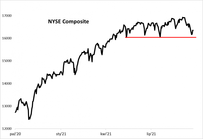 Obserwujmy też opisane indeksy – ewentualne przełamanie widocznych na wykresach poziomów wsparcia przez NYSE Composite czy Russell 2000 byłoby potwierdzeniem pogłębiania się negatywnej tendencji.