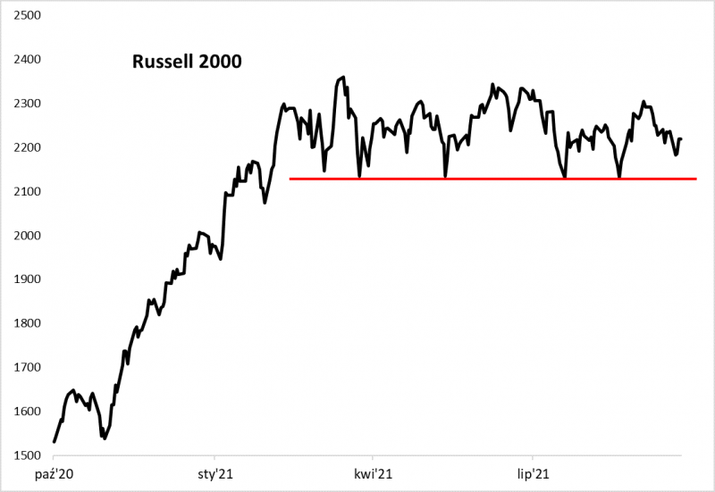 Brak hossy widać zresztą nie tylko na podstawie wysublimowanych wskaźników technicznych. Pokazuje to również szybki przegląd rozmaitych amerykańskich indeksów giełdowych. Już we wcześniejszych analizach zwracaliśmy uwagę na to, co od miesięcy dzieje się z benchmarkiem małych spółek, Russell 2000. Już od lutego tkwi on w trendzie bocznym. Wrześniowa korekta sprowadziła go z powrotem bliżej dolnego ograniczenia tej tendencji, czyli serii lokalnych dołków.