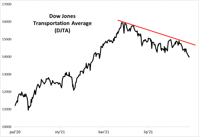 Na przysłowiowy deser zostawiliśmy jeszcze inny benchmark, należący do najbardziej klasycznych miar koniunktury Wall Street: Dow Jones Transportation Average (DJTA). Co prawda czasy swej świetności „średnia transportowa” ma już dawno za sobą, ale warto wspomnieć, że indeks ten stanowi przecież element słynnej teorii Dowa. Polega ona na tym, że jeśli DJTA podąża w innym kierunku niż siostrzany indeks „przemysłowy” (DJIA), stanowi to sygnał ostrzegawczy. Jest to o tyle interesujące, że średnia transportowa na przestrzeni ostatnich prawie pięciu miesięcy jest nie tyle nawet w trendzie bocznym jak wymienione wcześniej benchmarki, lecz w trendzie … spadkowym. W ostatnim tygodniu indeks znalazł się najniżej od … marca (!).
