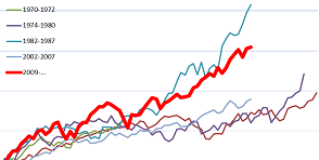 Reasumując, trwająca od pięciu lat hossa na Wall Street jest już w bardzo zaawansowanym stadium w porównaniu z większością historycznych rynków byka, z wyjątkiem wielkiej hossy z lat 1987-2000, której finalnym etapem była tzw. bańka internetowa.
