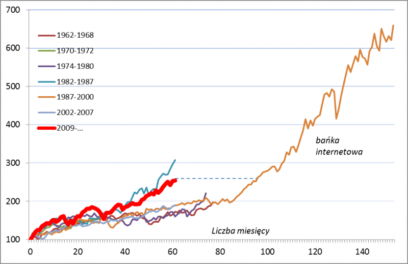 Warto ten obraz uzupełnić o siłę wzrostów. Obecna hossa jest jedną z najsilniejszych w historii: w ciągu pięciu lat S&P500 urósł o ponad 150 proc. Po upływie takiego czasu silniejszy był jedynie rynek byka w latach 1982-1987. Przypomnijmy co zdarzyło się potem: pamiętny krach na jesieni 1987 r. Ciekawe też, że taka skala zwyżki w trakcie wspomnianej hossy internetowej została osiągnięta dopiero po ok. 95 miesiącach.
