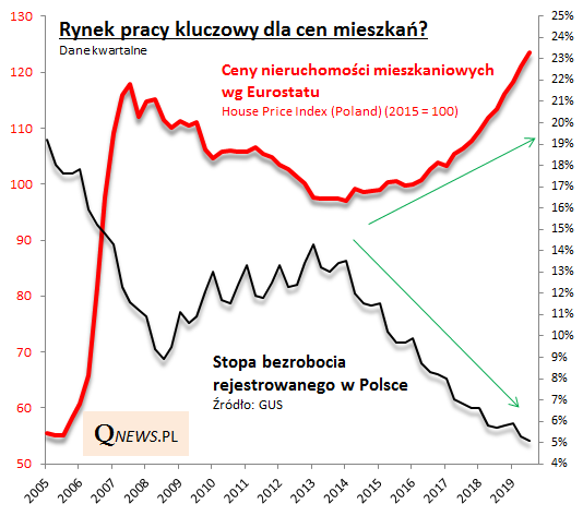 Drugi najważniejszy czynnik to ogólnie sprzyjająca koniunktura gospodarcza, której przejawem są niskie stopy bezrobocia. Cały czas podkreślamy, że historycznie trendy na polskim rynku nieruchomości były (i są) silnie skorelowane z sytuacją na rynku pracy. Ta od 2013 roku systematycznie się poprawia, czemu towarzyszy wzrost cen mieszkań i domów.