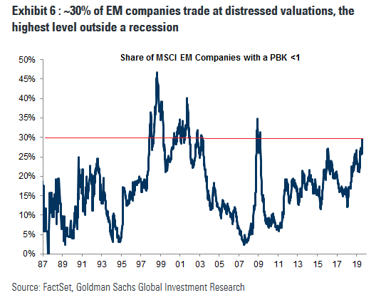 Okazuje się, że te zjawiska na GPW mają bezpośrednie odniesienie na rynkach wschodzących. Także tam grupa spółek z P/BV poniżej 1 wyraźnie powiększyła się na przestrzeni ostatnich kilkunastu miesięcy. Na emerging markets ten odsetek jest najwyższy nawet od ... 2009 roku, czyli od ostatniej wielkiej globalnej bessy.