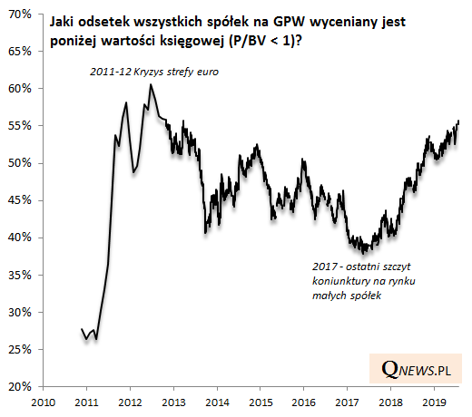Na początek kolejny najświeższy fakt, jeśli chodzi o wyceny polskich akcji. Już ponad 55% spółek na GPW wycenianych jest na rynku poniżej swej wartości księgowej. To odsetek najwyższy od 2012 roku, czyli od eksplozji obaw o rozpad strefy euro i "drugie dno recesji" (analogia do obecnej sytuacji jest dość ewidentna). Wtedy punkt kulminacyjny został osiągnięty, gdy poniżej wartości księgowej było notowanych nieco ponad 60% firm.