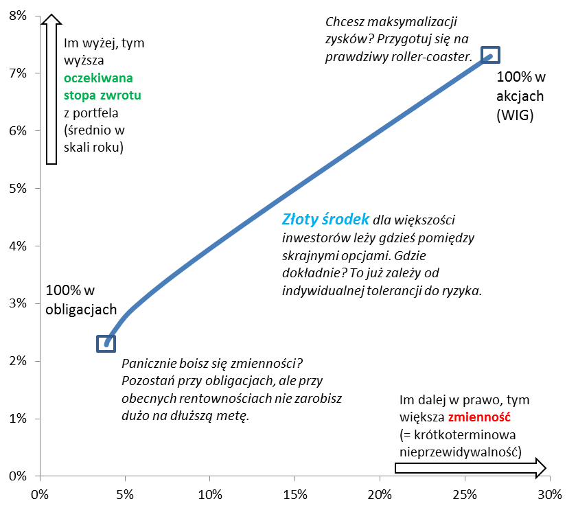 W początkowym punkcie linii mamy przysłowiowego miłośnika obligacji, który uwielbia je ze względu na niską zmienność. Przy obecnych realiach musi się on jednak liczyć z niskimi przyszłymi stopami zwrotu. W drugim ekstremum mamy miłośnika akcji, który uwielbia je za wysoką prognozowaną stopę zwrotu (takich miłośników obecnie można ze świecą szukać…). Z kolei on musi liczyć się z wysoką zmiennością, wg historycznych danych prawie 7 razy wyższą (!!!) niż w przypadku obligacji.