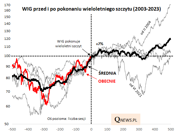 Rzecz jasna, pod uśrednioną ścieżką kryją się odbiegające od niej indywidualne scenariusze. Mamy tu dość spory przekrój, począwszy od tego najsłabszego z 2021 roku (gdy WIG kilka miesięcy po ustanowieniu rekordu zakręcił w przeciwnym kierunku), a skończywszy na tym najlepszym z 2004 roku (gdy indeks miał przed sobą jeszcze kilka lat bardzo silnej hossy - nawet wtedy jednak w początkowej fazie nie odbiegał mocno od średniej).