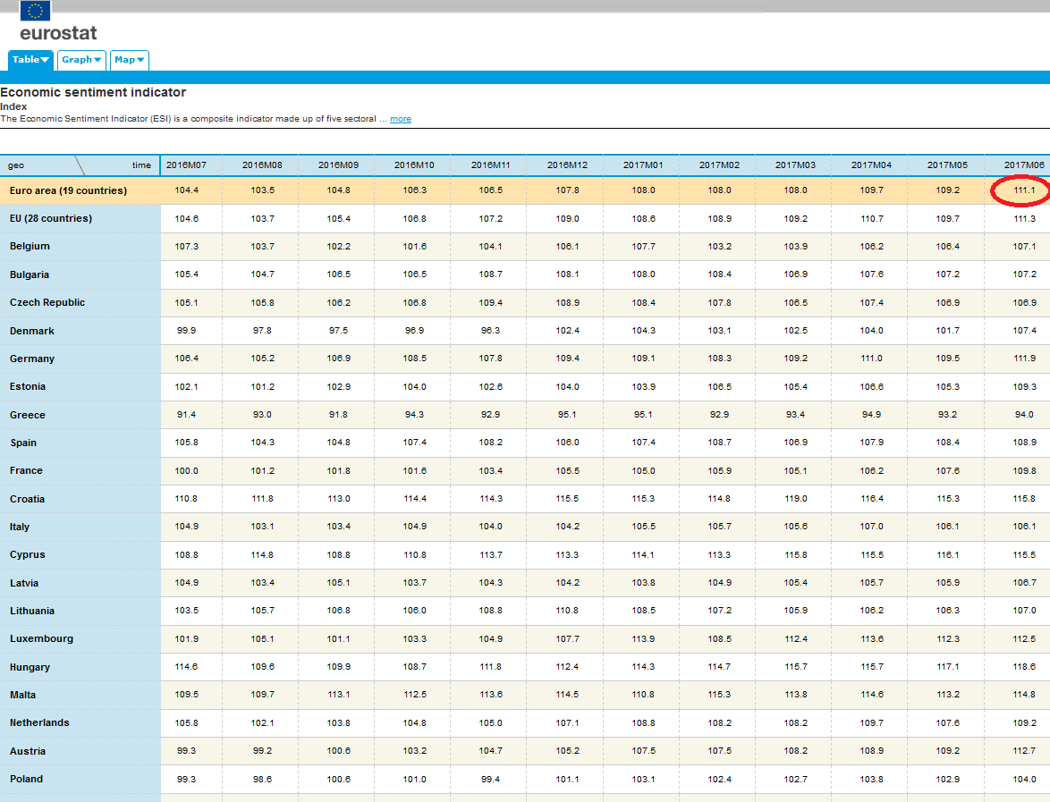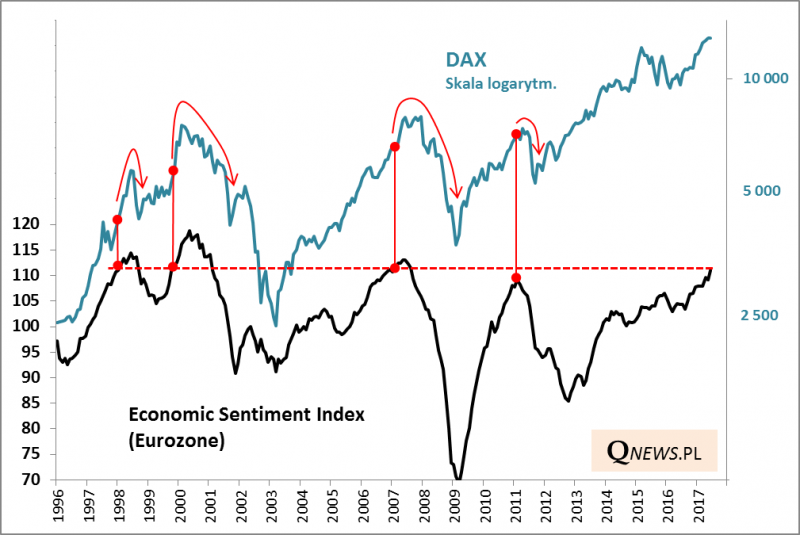 Najnowszy odczyt Indeksu Nastrojów w Gospodarce (Economic Sentiment Index, ESI) dzieła Eurostatu świetnie wpisuje się w trend, w jakim są inne monitorowane przez nas wskaźniki "sentymentu" przedsiębiorców (Ifo) i konsumentów (WWUK). Dzięki swej długiej historii i kompleksowej metodologii (obejmuje różne działy gospodarek) ESI nawet lepiej nadaje się do "obróbki" z punktu widzenia inwestorów. W czerwcu indeks zawędrował do 111,1 pkt. - to poziom najwyższy od ... sierpnia 2007. Na wykresie pokazujemy punkty, w których ESI w przeszłości dotarł do takich pułapów (w 2011 zwyżka zatrzymała się nieco poniżej).