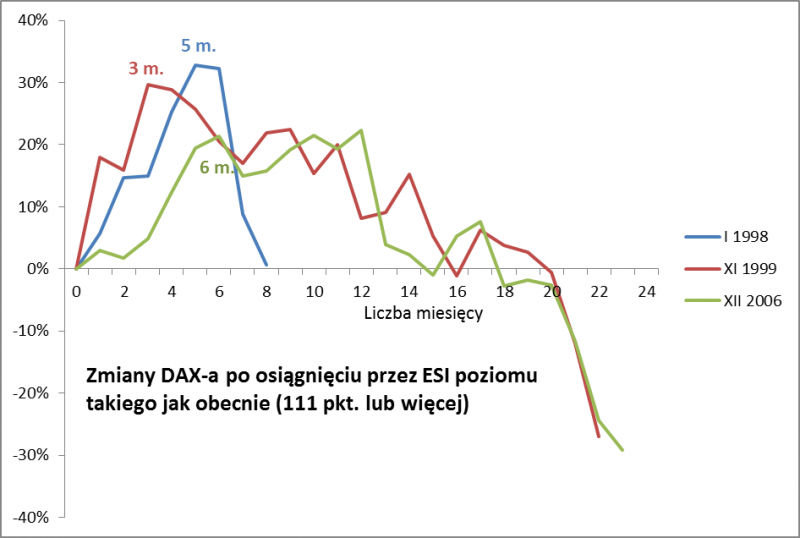 - Na razie sprawdza się powiedzenie "trend is your friend" - rośnie indeks nastrojów, rosną kursy akcji. Warto zwrócić uwagę, że w końcowej fazie giełdy przeżywały wręcz euforię - DAX w ciągu kilku (3-6) miesięcy rósł jeszcze o kolejne 21-33%.