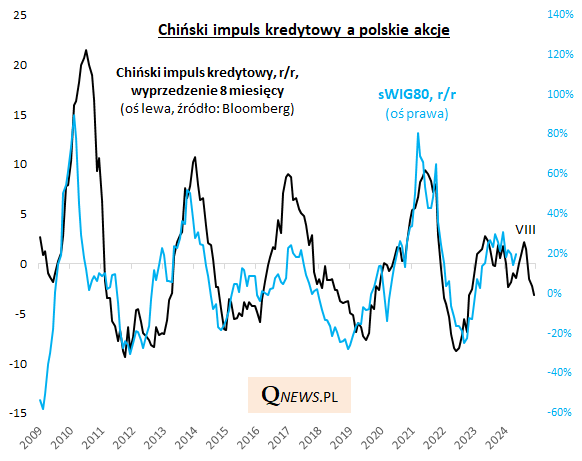 Ale temat Chin, to także poruszany już przez nas niegdyś temat tzw. chińskiego impulsu kredytowego. Jakiś czas temu doszukiwaliśmy się w nim właściwości wyprzedzających względem naszych rodzimych akcji ze względu na pośrednie znaczenie chińskiej gospodarki. Zwracaliśmy uwagę, że chiński impuls kredytowy z wyraźnym, nawet 8-miesięcznym, wyprzedzeniem trafnie zasygnalizował zarówno szczyt koniunktury na GPW w 2021 roku, jak i dołek na jesieni 2022.